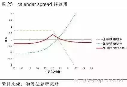 上面我们提到的策略使用的均是同一到期日的合约的价差进行套利,期权当然也可以进行跨期套利,日历价差(calendar spread)便是其中的一种。Calendar spread通过卖出1份近月call/put,同时买入1份相同行权价的远月call/put构成,这利用的是近月合约时间价值损耗速度大于远月合约的特点。行权价的选择上,平值期权是最佳选择。