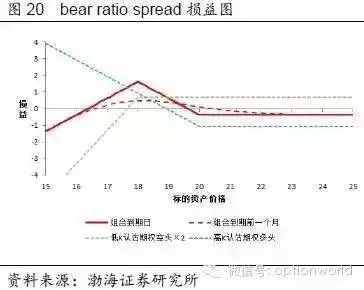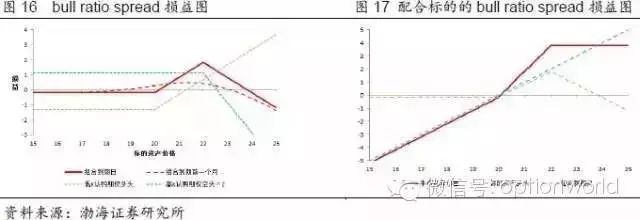 如果单纯买入bull ratio spread,则组合通常会在标的价格小幅上涨的情况下获利,其下行风险有限而上行风险无限(如选择的N较大,甚至可能在价格下跌时盈利,但此时价格大涨的情况下风险更大),属于中性偏多的策略。