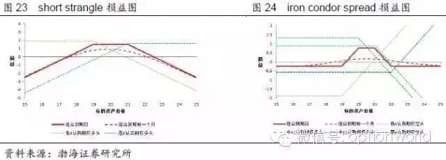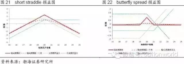 仅使用call或者仅使用put也可以得到和iron butterfly spread相同的损益曲线,此时需要买入1份行权价较低和1份行权价较高的call/put,同时卖出2份行权价中等(前两份期权行权价的平均值)的call/put,卖出的期权一般选择平值期权,此时的组合成为蝶式价差组合(butterfly spread)。构成相同损益曲线的这三种组合,投资者同样可以选择较“便宜”的进行建仓。