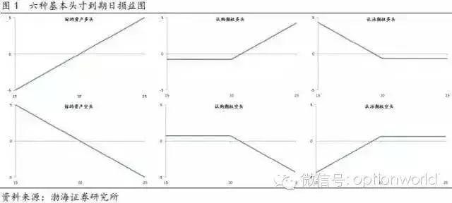 存续期内期权的损益变化是在期权价格-标的资产-时间三维曲面中的一条曲线,到期日期权头寸损益是确定的(作为买入开仓我们到期最多亏损权利金),为了便于分析,我们往往选取该曲面在到期日这一时间切片上的损益图来进行分析。标的资产的损益较为简单,为一条直线,而期权头寸到期日的损益则较复杂,是非线性的。六种基本头寸的到期日的损益图如图1所示。
