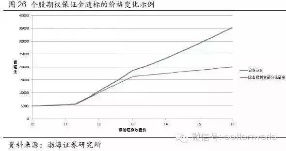 由于卖空期权是保证金交易,因此包含期权空头头寸的策略便涉及到保证金管理的问题。与期货不同,期权的保证金是非线性的,这给投资者的保证金管理增加了难度。以行权价和现价均为13元的个股期权为例,由图26可以看出除了深度虚值的期权,其他期权的保证金变化是非常快的,因此卖空这些期权需要注意留出足够的保证金以防止爆仓。