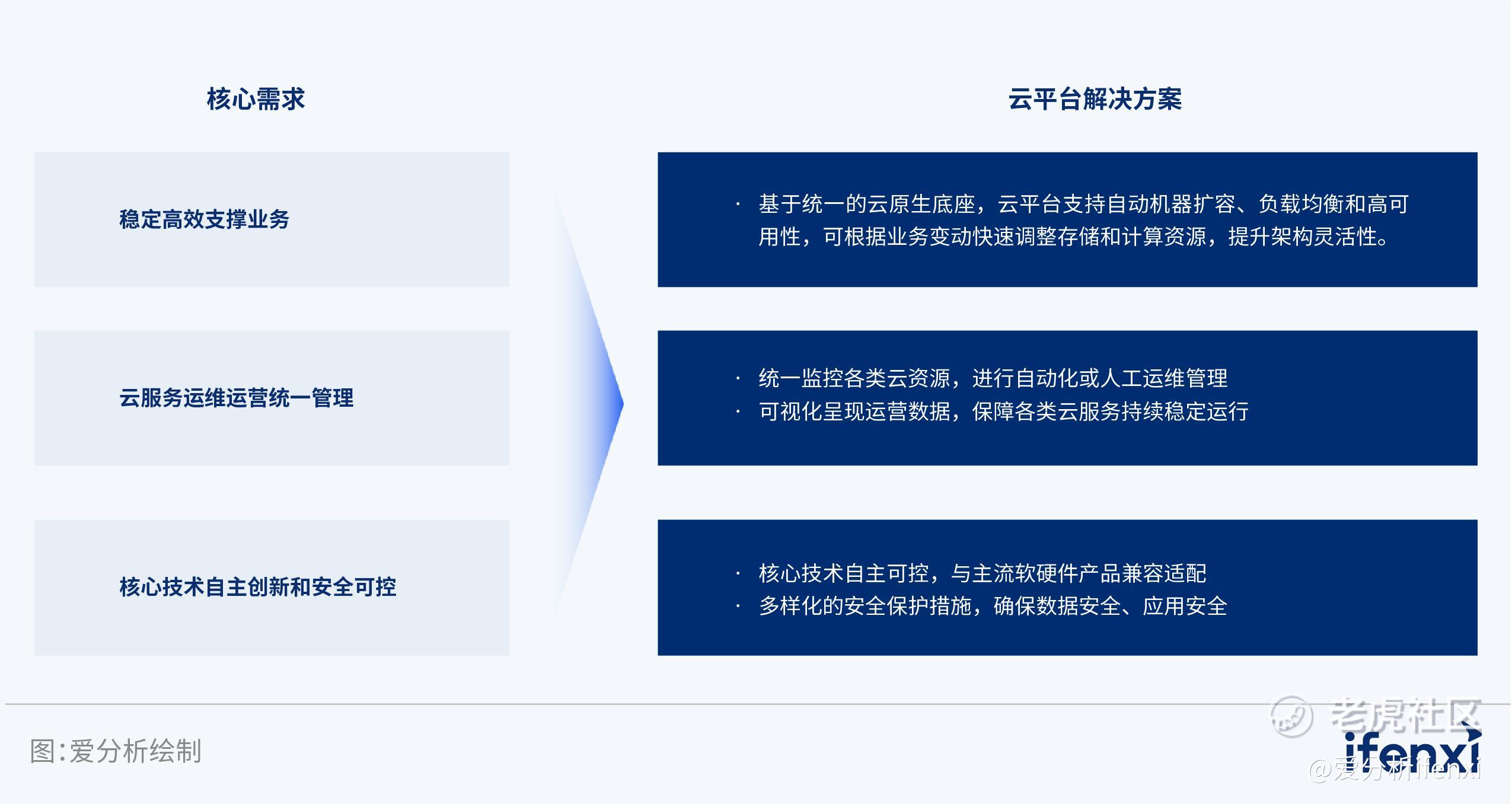 云平台作为企业发展的数字化底座,在激发企业数据价值、强化智能化创新应用实践、保障数据资产安全方面具有重要作用。随着数字化转型的持续深入,对云基础设施提出了更高的要求,央国企不再只是关注云平台建设,而是更加关注如何管好云、如何通过深度用云驱动业务创新升级;上云范围也逐渐从以大数据服务和互联网应用为主,转向核心业务全面上云。在此之下,央国企对云平台的需求从原来的优化资源利用效率,逐步升级为稳定高效支撑业务、云服务运维运营统一管理、以及核心技术自主创新和安全可控。