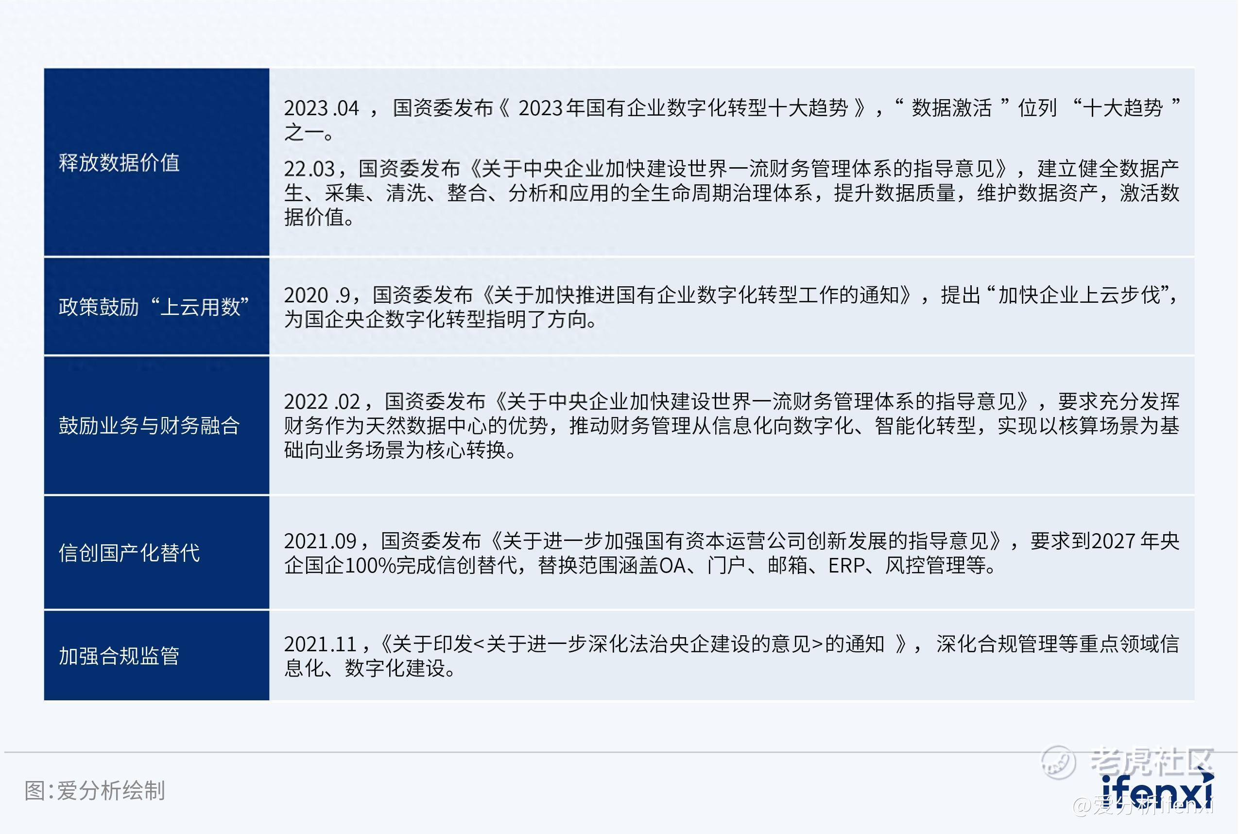 政策指引:早在2020年,国资委发布了《关于加快推进国有企业数字化转型工作的通知》,对国企数字化转型的基础、方向、重点及举措做出全面部署,也吹响了国企大规模数字化转型的号角。此后上云用数赋智行动、十四五规划、数字中国建设等一系列政策文件均为央国企数字化转型指明了方向,包括加快释放数据价值、鼓励企业“上云用数”、信创国产化替换、加强合规监管等。
