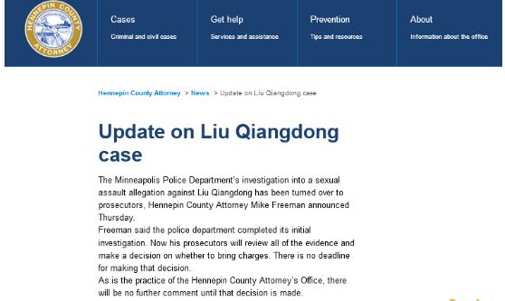 这不,刚刚消停没多久的东哥性侵案,又有了新的动向。北京时间9月20日晚间,美国明尼苏达州亨内平县检察官麦克·弗里曼刚刚对外宣布,明尼苏达警方已完成对案件的初步调查,接下来将由检方接手,审查案件全部证据,并最终决定是否起诉。何时做出最终决定并没有最后的期限,警方和检方表示在做出决定之前不会发布任何进一步的评论。