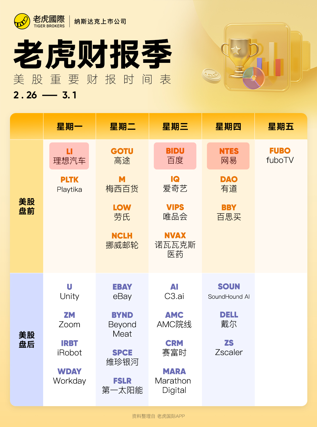 本周 $理想汽车(LI)$ , $百度(BIDU)$ , $网易(NTES)$ 等中概股龙头将陆续公布财报,此外 $C3.ai, Inc.(AI)$ 、 $SoundHound AI Inc(SOUN)$ 等人工智能概念也值得重点关注噢!小虎们快来和财报虎一起看看吧![YoYo]