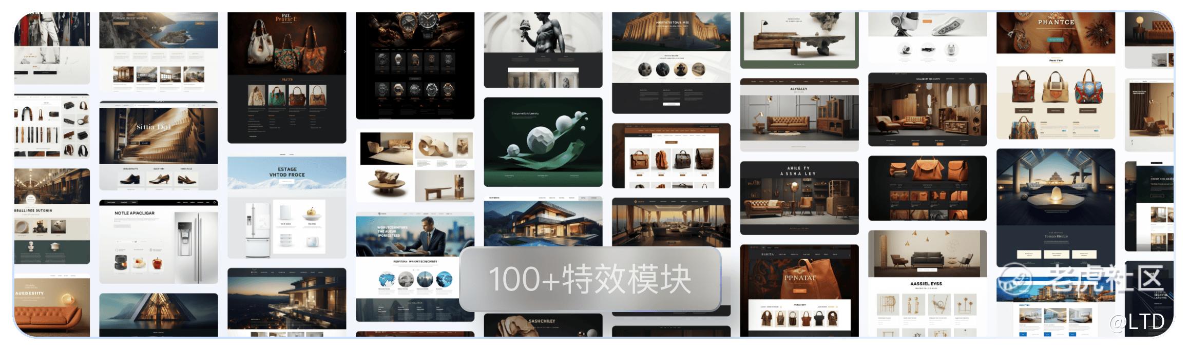 同时,为了减少用户构建网页的难度,我们在2023年也陆续加入了近百个包含导航栏、内容列表、轮播图、信息展示等多个不同功能的 特效模块。一键拖入页面区域即可完成应用。