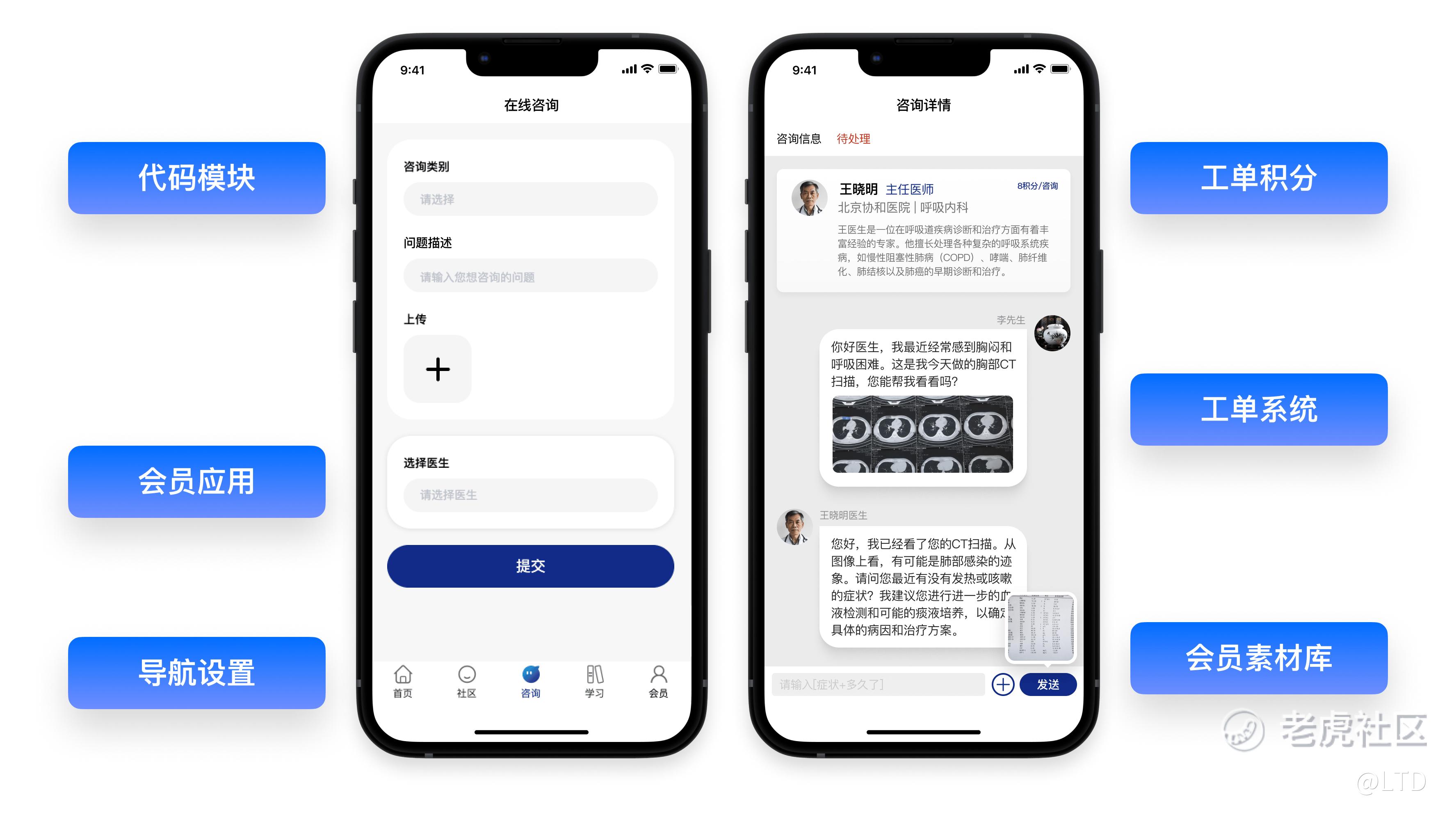 其中一个典型的业务场景是 医疗咨询平台 ,医生与病人在平台注册账号,用户通过咨询平台向医生进行咨询、医生之间也可以通过积分形式进行疑难杂症的沟通交流。