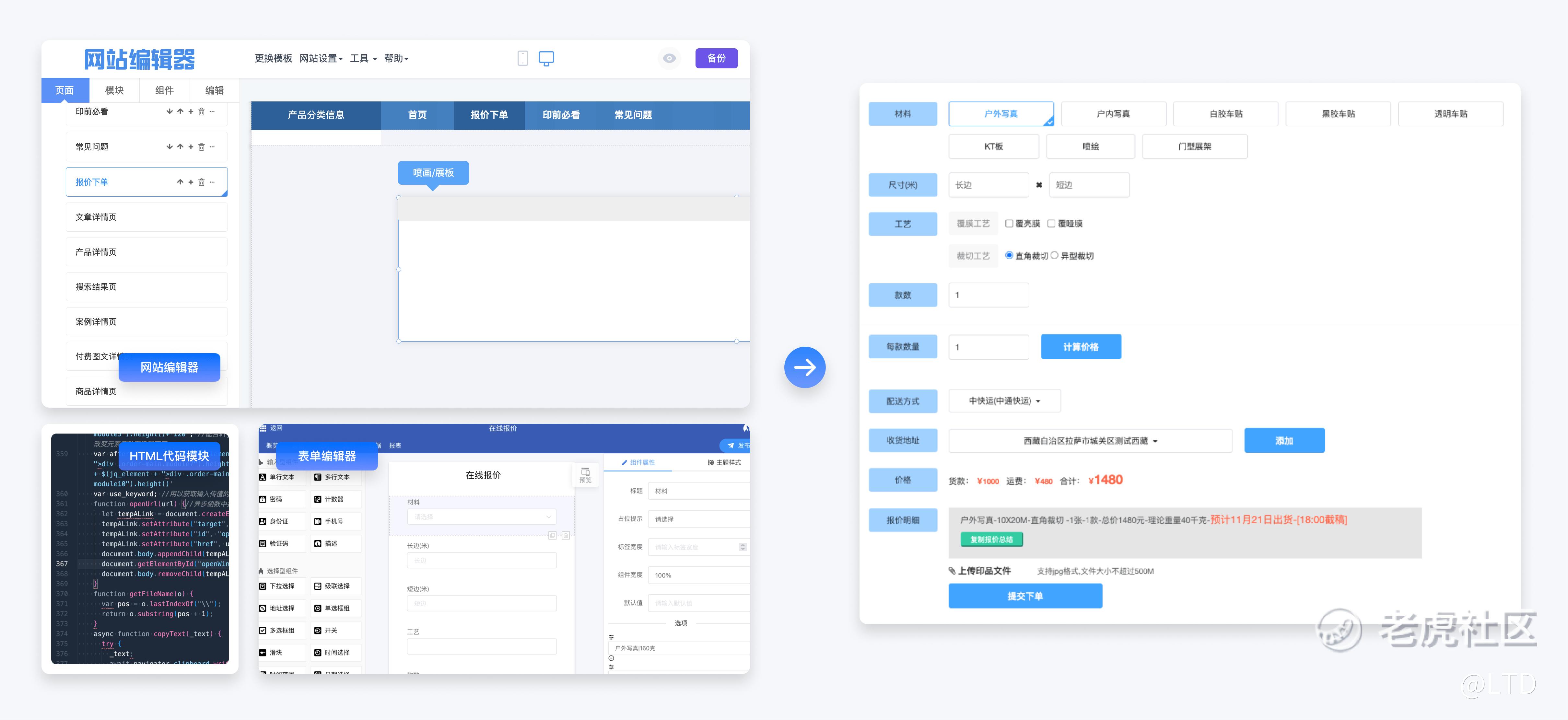 基于网站编辑器、代码模块、表单编辑器等系统能力,我们得以构建出可高度自定义样式、字段配置可视化、规则设置灵活的即时报价应用。