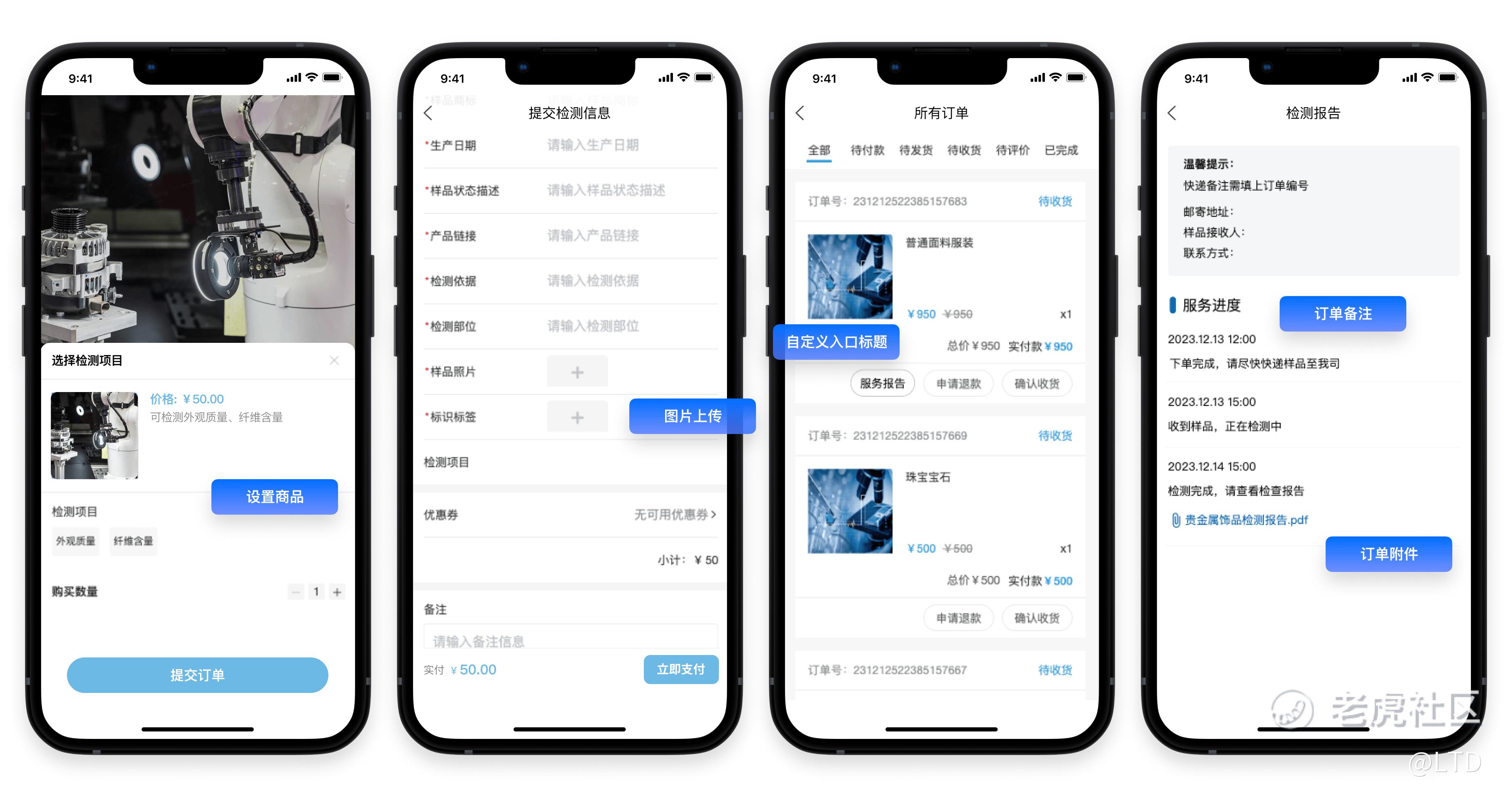 以付费在线检测业务为例,用户通常会在手机上进行下面的操作: 购买在线检测项目 - 上传检测资料与填写项目 - 查看服务进度 - 获取服务报告。