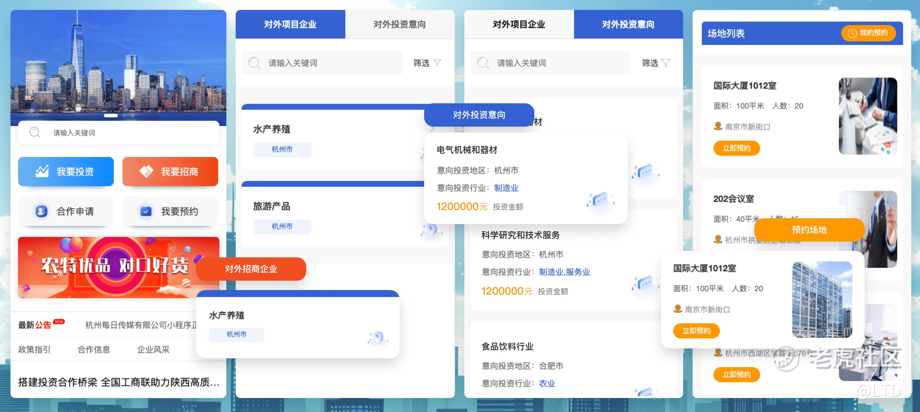 用户可以通过这个平台发布自己的招商需求与投资需求;也可以查看平台上所发布的招商信息和投资信息,并提交意向。