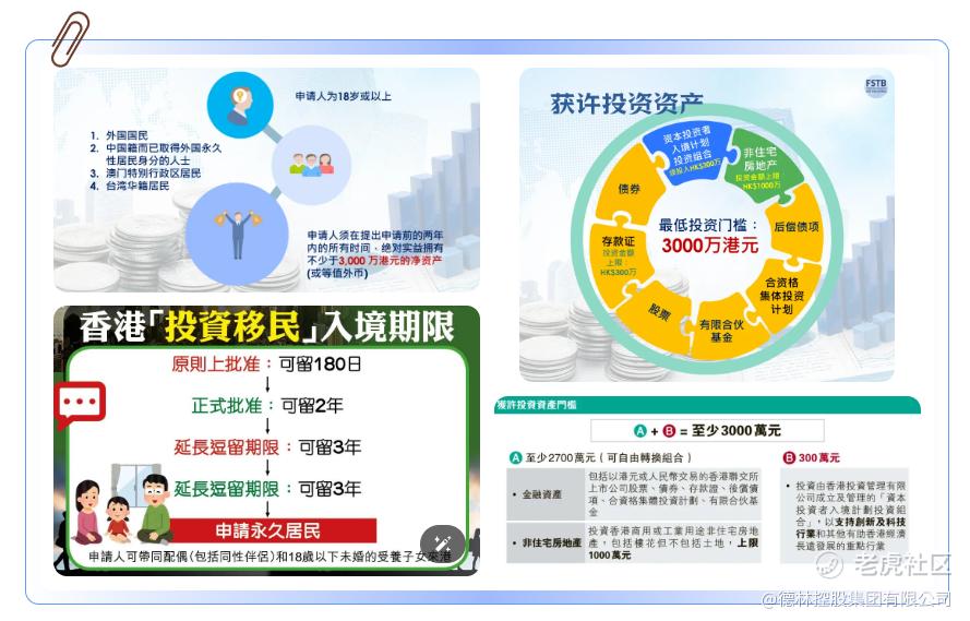 按照新计划要求,合资格申请人须投资最少3,000万港元于获许投资资产。获批申请人可携同其受养人(包括其配偶及其18岁以下未婚及受养的子女)来港。申请人及其家庭成员(包括配偶与18岁以下子女)将可获得最初两年的居留权。此后,可申请延期,每次延长三年,居住满七年后更可申请成为香港永久居民。