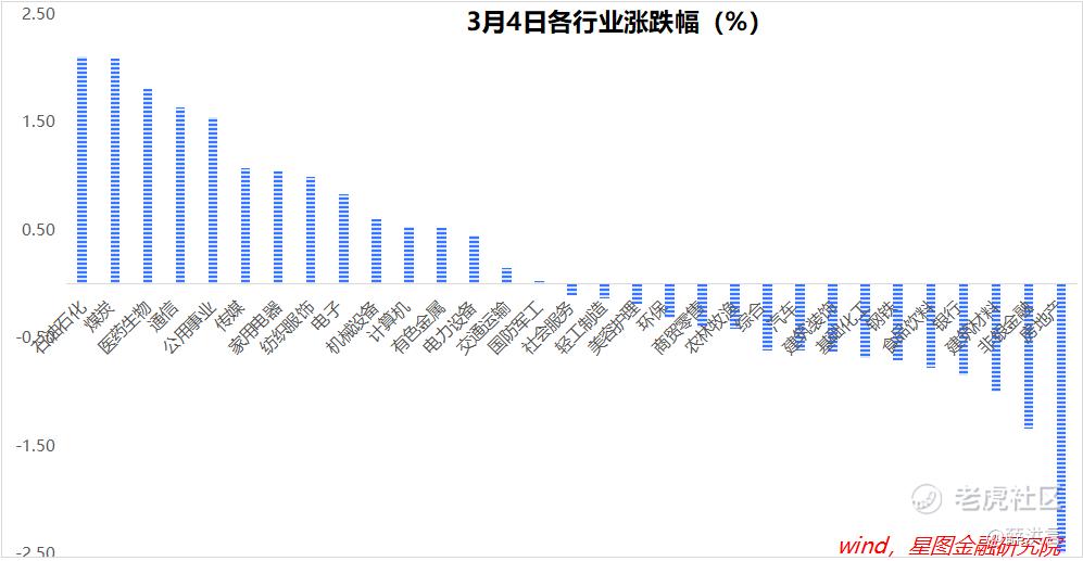 行业层面,地产(-2.51%)、非银金融(-1.34%)、建筑材料、银行、食品饮料领跌;石油石化(2.11%)、煤炭(2.09%)、医药生物(1.81%)、通信、公用事业、传媒等板块领涨,涨幅均超过1个百分点。