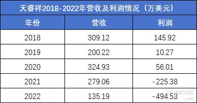 在2020年短暂的回到300万美元以上的营收后,天睿祥2021年、2022年营收分别为279.06万美元、135.19万美元,分别较上年同期下滑14.2%、51.6%。