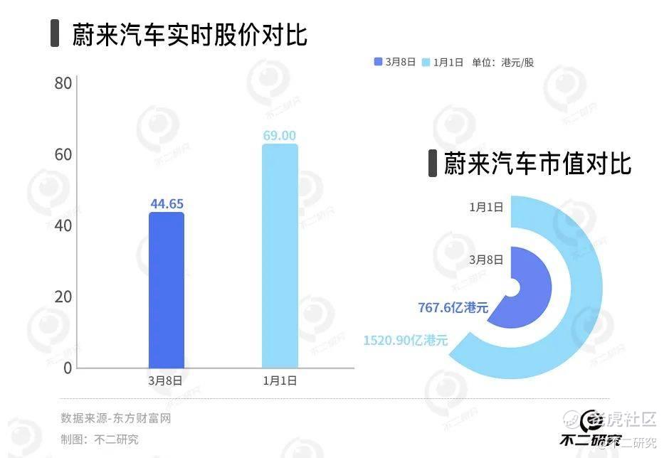 截至3月8日港股收盘,蔚来汽车报收44.65港元/股,对应市值767.6亿港元(约折合人民币705.58亿元);对比2024年1月的市值高点1520.90亿港元,其市值已蒸发753.3亿港元(约折合人民币692.47亿元)。