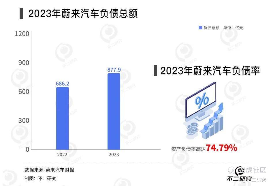 截止2023年12月31日,蔚来负债总额为877.87亿,同时,其资产负债率高达74.79%。