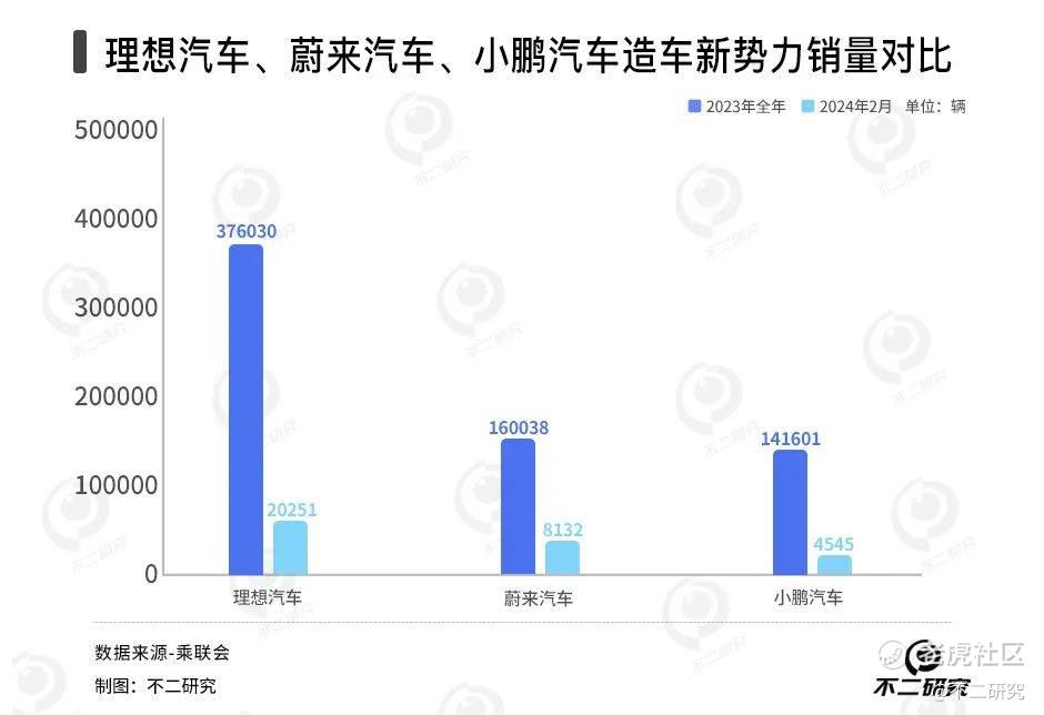 根据最新公布的销售数据:2024年2月,理想汽车的交付量分别达到20251辆,同期,蔚来的交付量只有8132辆;而小鹏汽车则为4545辆。