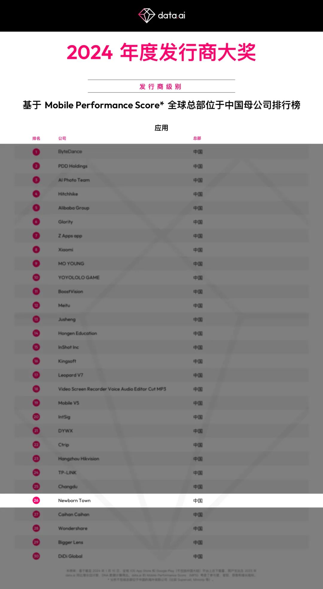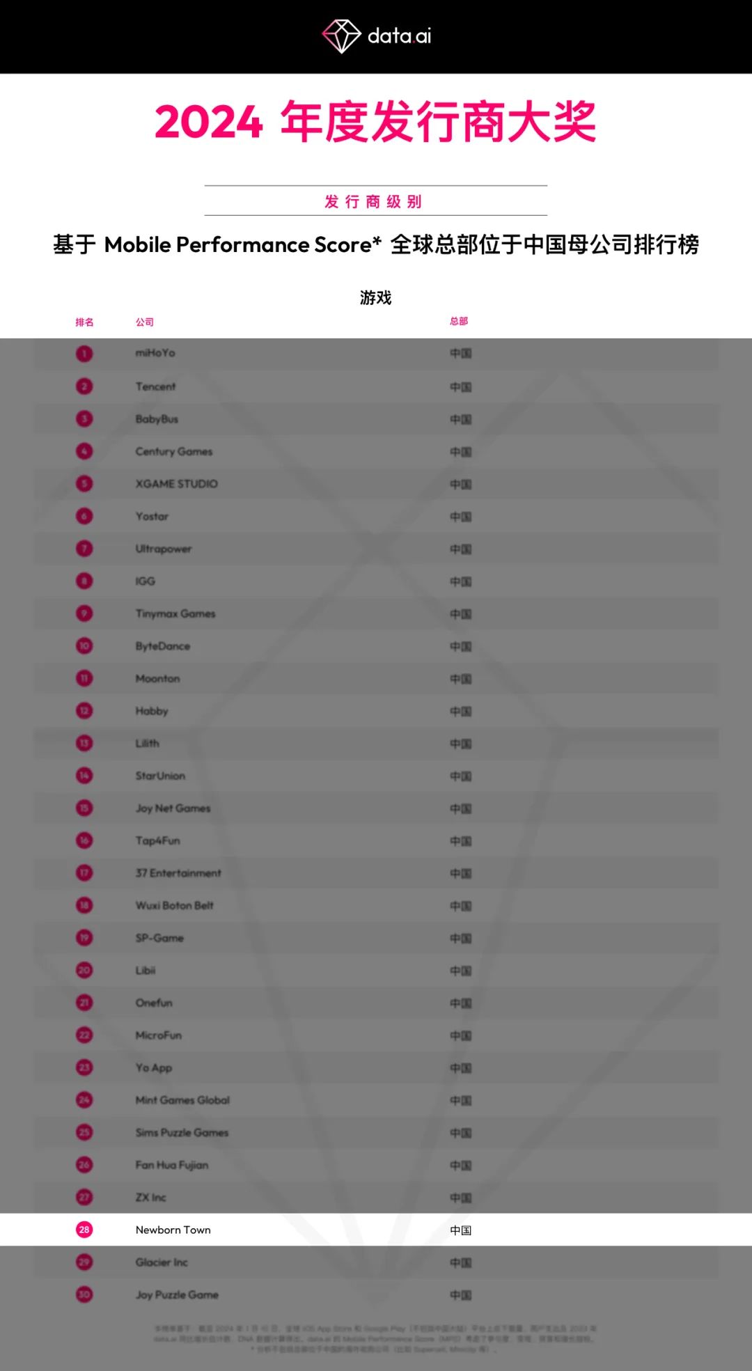 3月7日,数据分析机构data.ai发布了“2024年度发行商大奖”名单,以表彰过去一年中,在全球范围内取得杰出成就的移动应用企业。其中,赤子城科技Newborn Town凭借多款社交应用的优异表现及旗舰游戏规模的快速增长,成功入围应用发行商、游戏发行商双榜,分别位列第26、第28名。