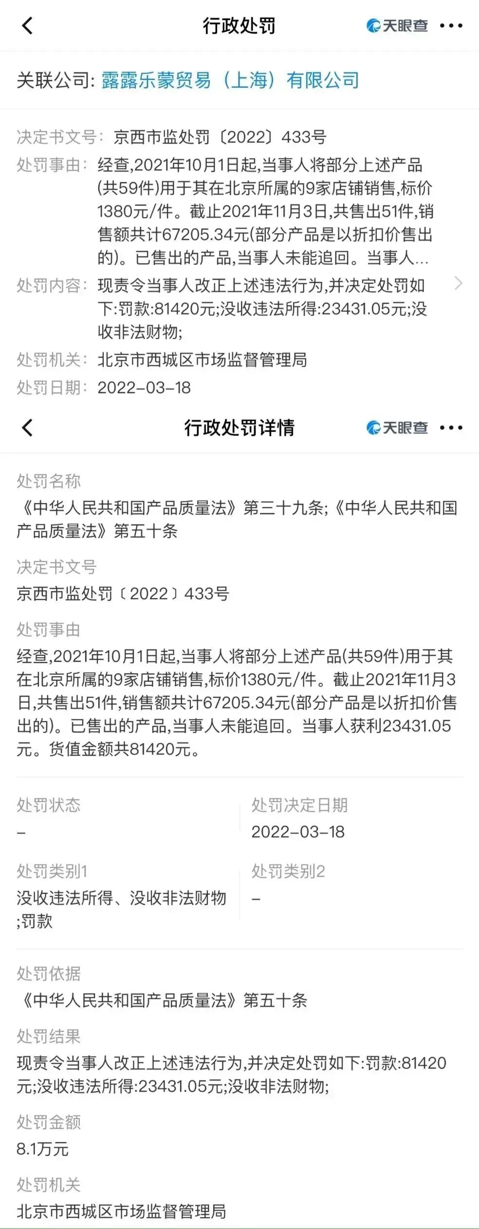 天眼查显示,lululemon因关联公司露露乐蒙贸易(上海)有限公司违反《中华人民共和国产品质量法》第五十条(在产品中掺杂、掺假,以假充真,以次充好,或者以不合格产品冒充合格产品)等条例,被北京市西城区市场监督管理局罚款8.1万余元。没收违法所得2.3万余元。