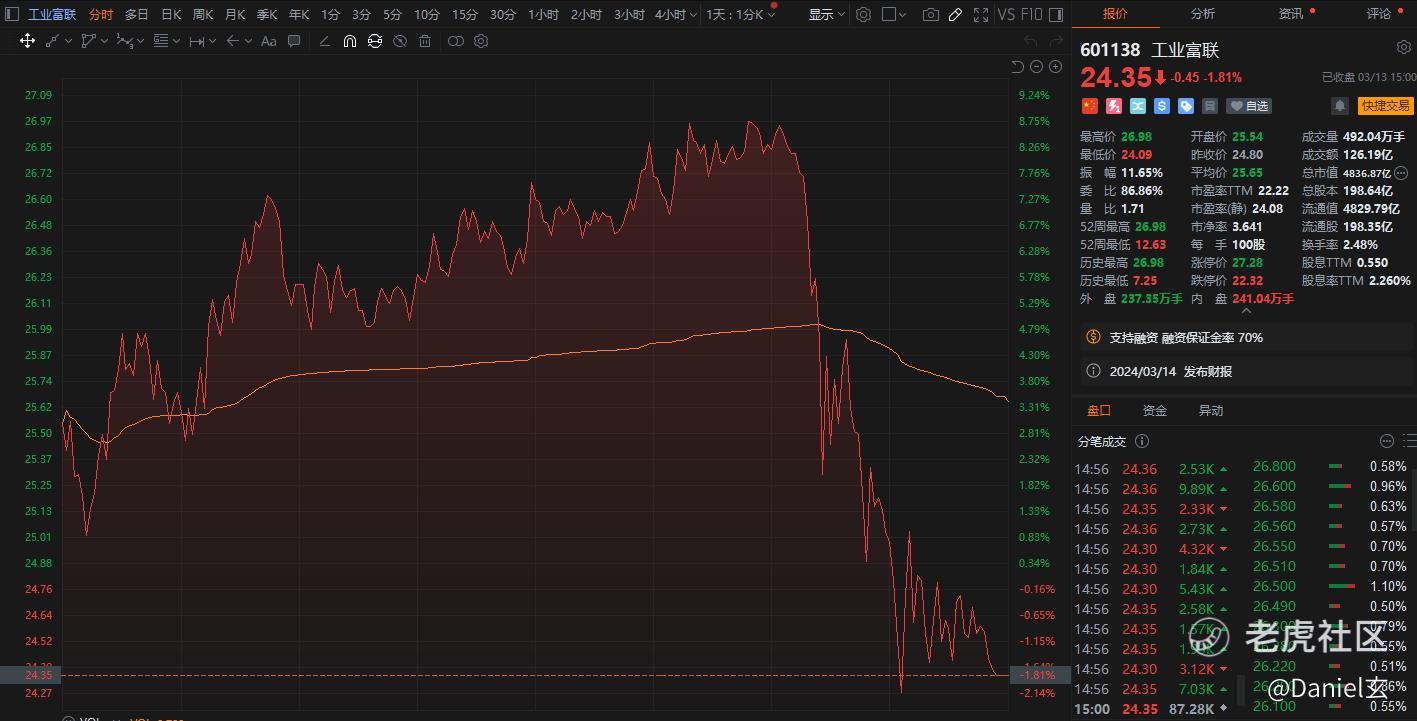 昨晚英伟达暴涨 7%,盘中工业富联一度 +8%,但午后突然大跳水,收盘 -1.8%,A股AI的走势,当然,这也跟他有传闻说业绩不及预期有关系,我不知道朋友们是怎么看的,我个人觉得是非常不及预期的,本质上工业富联走的就是台积电代工逻辑,而工业富联和台积电是不能比的,一个是高端代工,一个是低端代工,不能相并论。