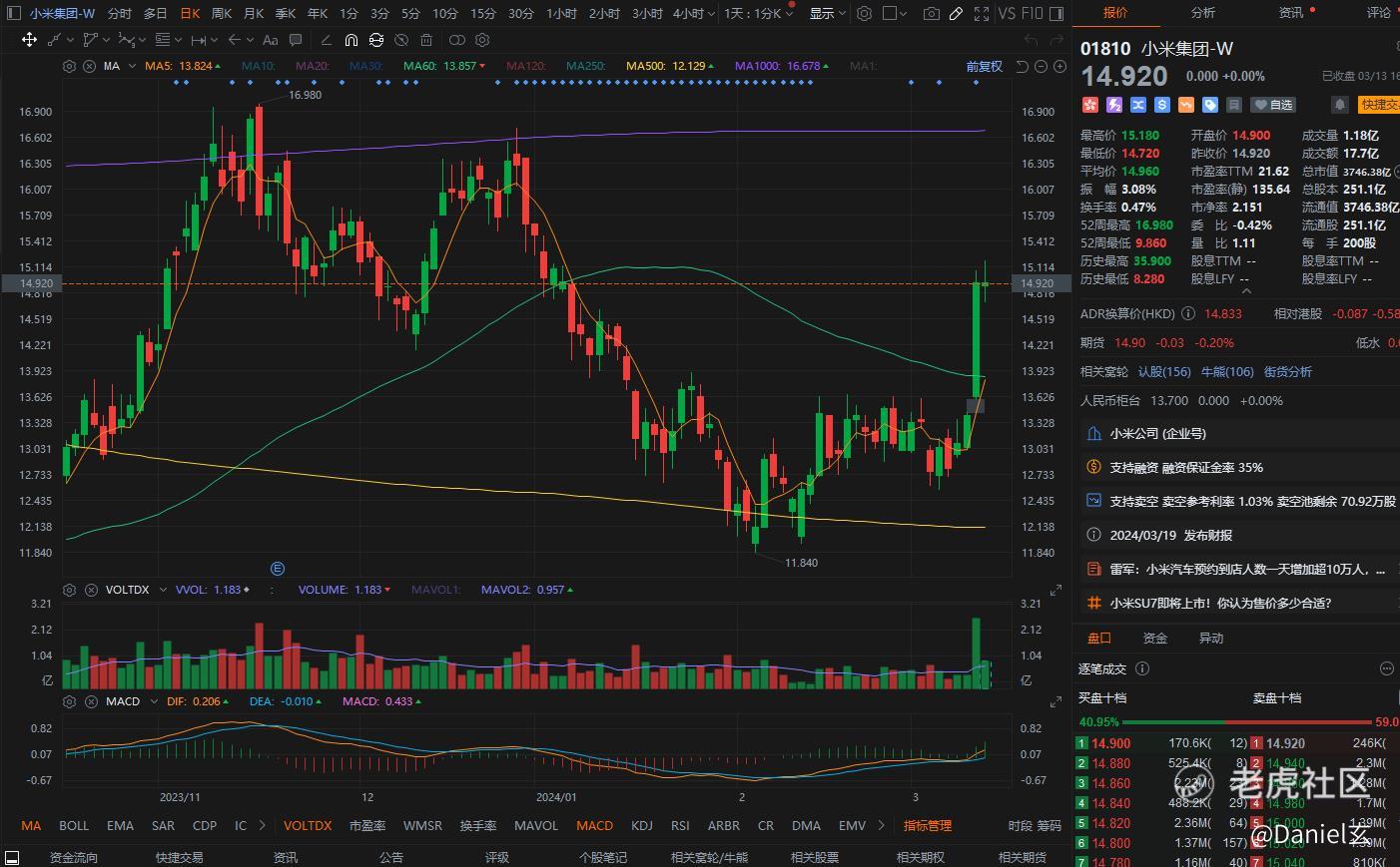 1、$小米集团-W(01810.HK)$ 昨天雷军刚刚官宣小米 SU7 的发布时间,到今天预约到店的人数已经增加了 10 多万人,当然,后续更关键的还是要看转换率能有多少,不过,虽然目前市场上对小米汽车的争议很大,但目前的热度确实超出预期,小米集团午后涨超 1%,之后收盘回落。