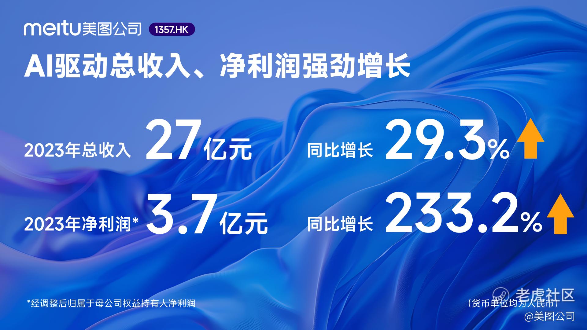 2024年3月15日,美图公司(1357.HK)披露2023年业绩报告:总收入27亿元(人民币,下同),同比增长29.3%。经调整后归属于母公司权益持有人净利润3.7亿元,同比增长233.2%。