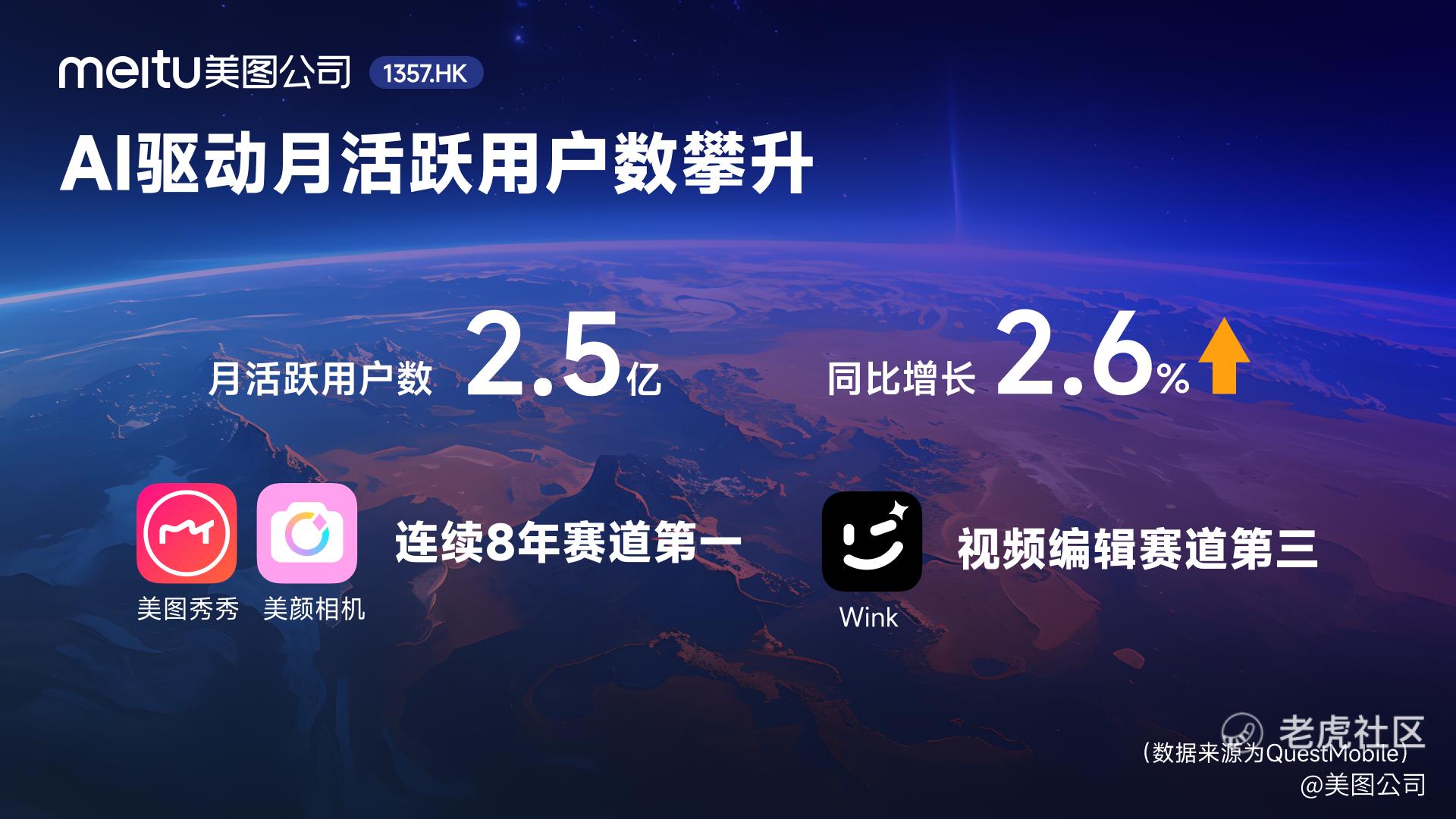 截至2023年12月31日,美图公司月活跃用户数达2.5亿,同比增长2.6%。