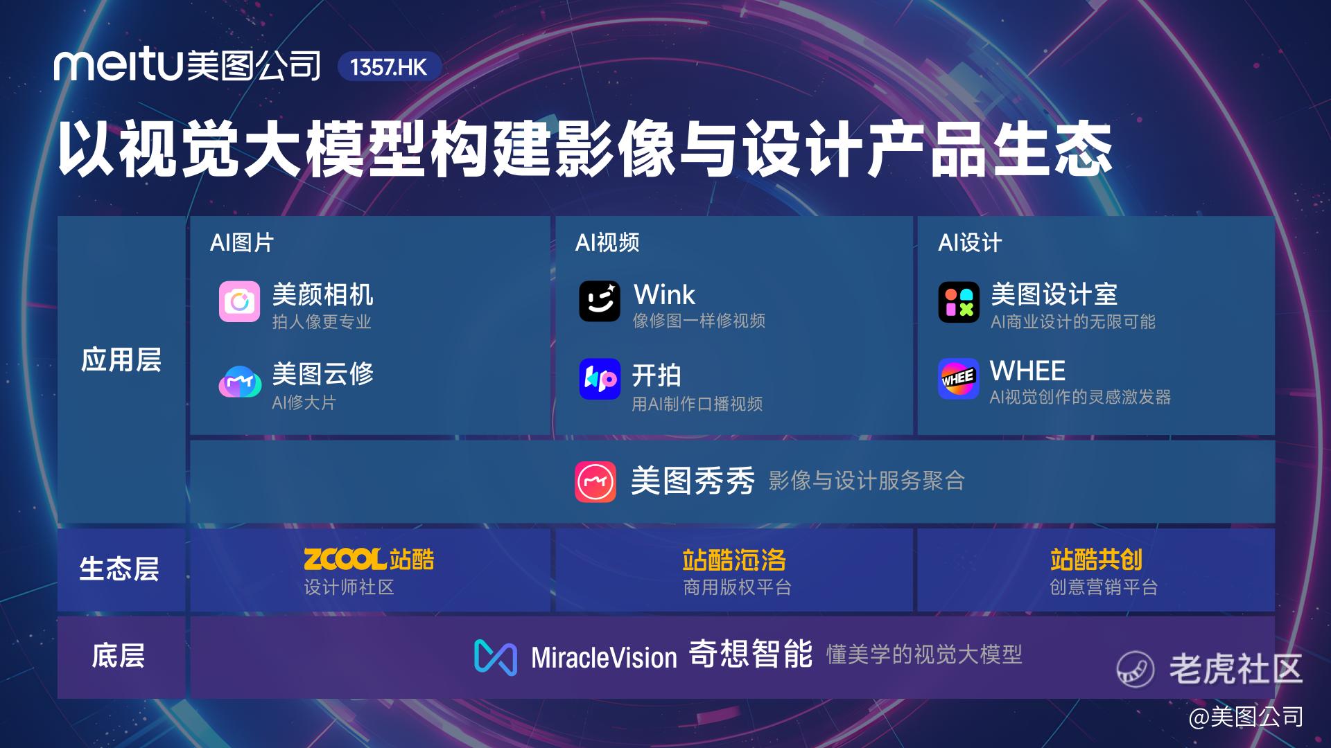 美图公司聚焦“生产力和全球化”战略,以2023年6月推出的美图视觉大模型MiracleVision(奇想智能)为基石,形成由底层、生态层和应用层构建的AI产品生态。