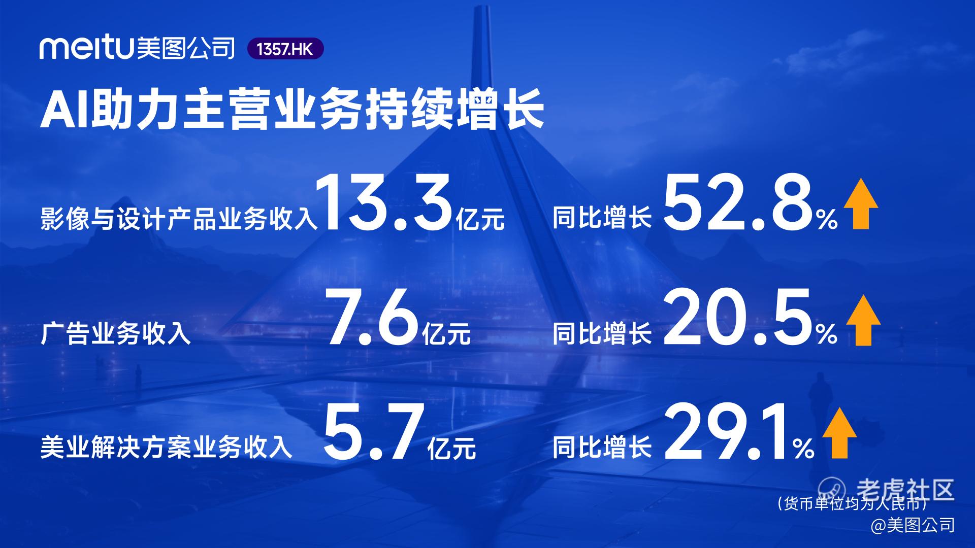 2023年,美图公司以付费订阅为主的影像与设计产品业务收入13.3亿元,同比增长52.8%;广告业务收入7.6亿元,同比增长20.5%;美业解决方案业务收入5.7亿元,同比增长29.1%。