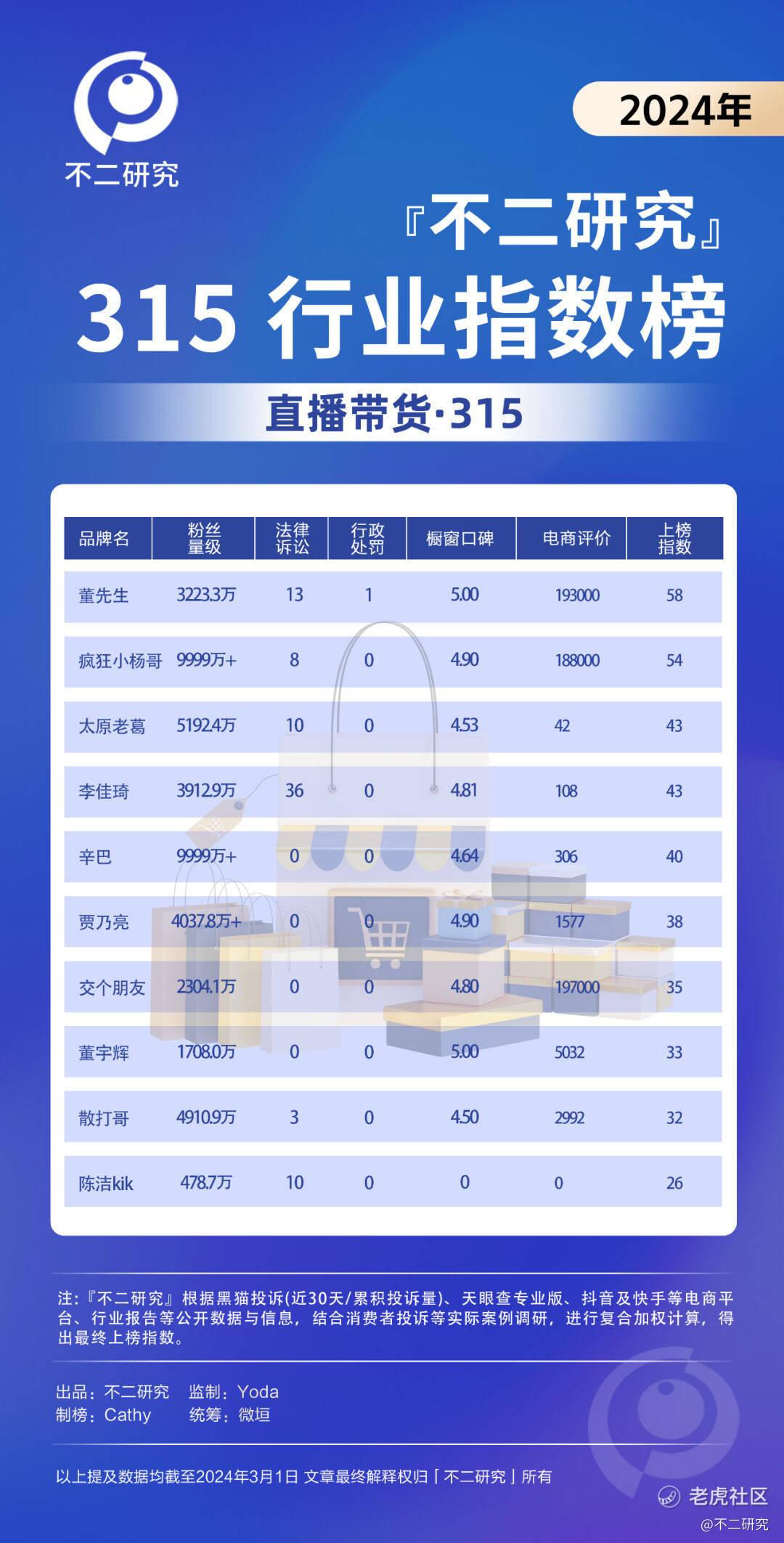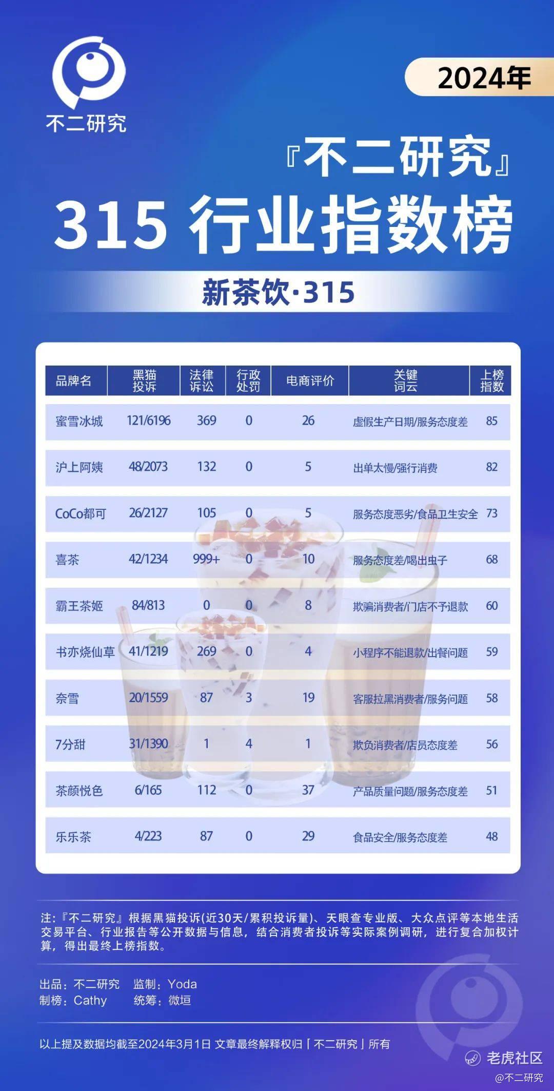 在2024年3.15期间,「不二研究」选取新能车、新餐饮、新茶饮、美妆、家用电器、直播带货6个行业,根据黑猫投诉、天眼查专业版、天猫及京东电商平台、大众点评等本地生活交易平台、行业报告等公开数据与信息;结合消费者投诉等实际案例调研,进行复合加权计算,得出2024年「不二研究」315行业指数榜。如下: