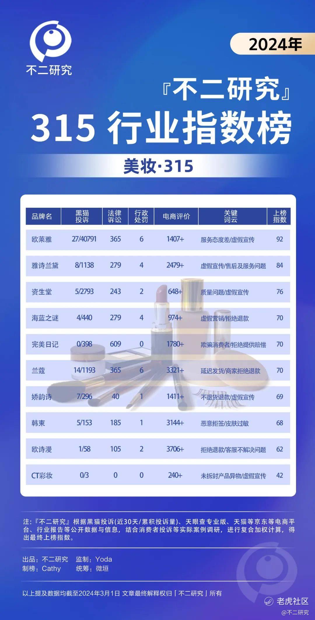 在美妆品类,「不二研究」调研了近百个活跃品牌样本,其中欧莱雅、雅诗兰黛、资生堂、海蓝之谜、完美日记、兰蔻、娇韵诗、韩束、欧诗漫、CT彩妆10个品牌的上榜指数较高。以上榜指数最高的欧莱雅为例,其最严重的问题为服务态度差和虚假宣传。