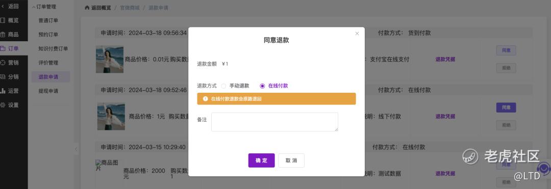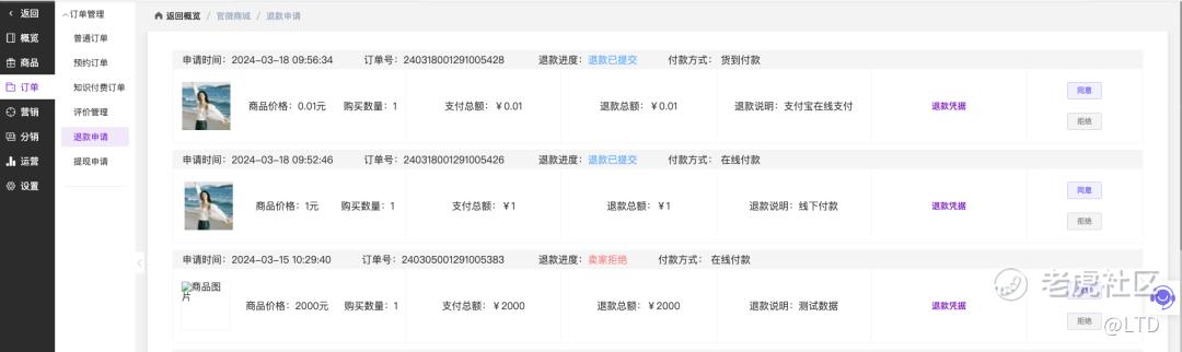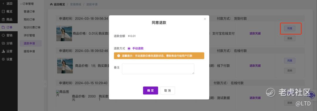 点击每条申请右侧的「同意」按钮,即可进行退款操作。