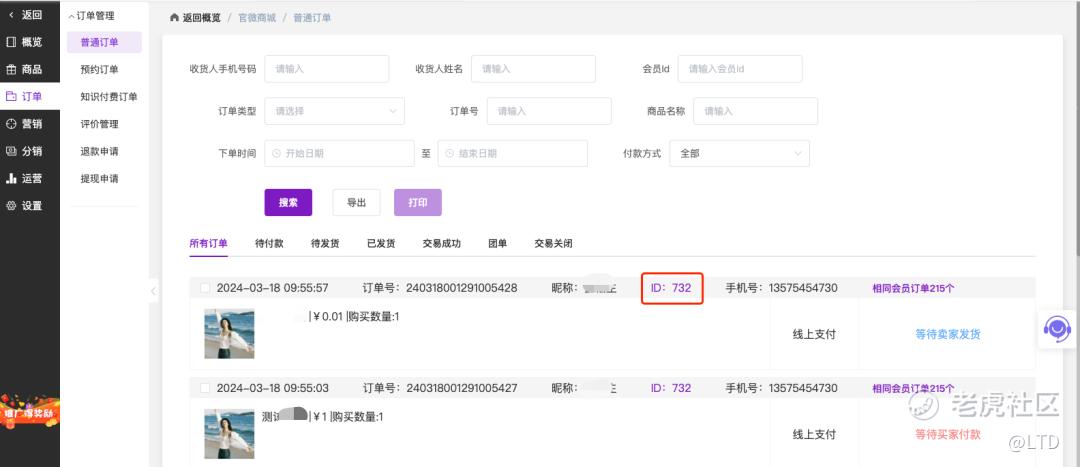 如下图所示,在普通订单与知识付费订单的订单列表中,会员ID提供了直接打开会员详情页的超链接。降低查看下单会员的步骤,可提高操作效率。