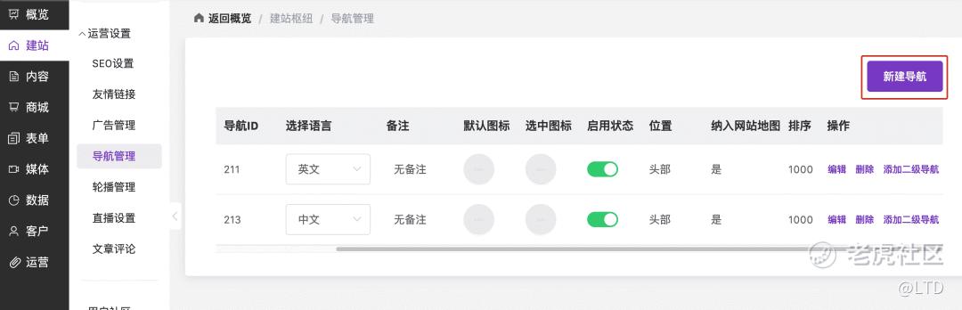 操作路径:官微中心 - 建站 - 运营设置 - 导航管理
