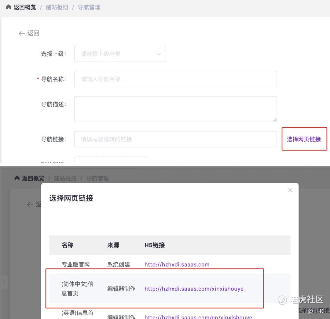 在导航管理中,当通过「选择网页链接」功能选择网站内的页面链接时,将所设置的链接从包含域名的完整URL调整为只保存相对路径。避免当网站域名调整后,原先所设置的链接无法使用的问题。