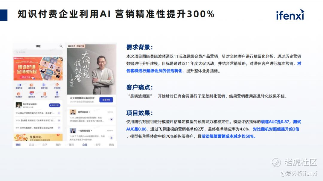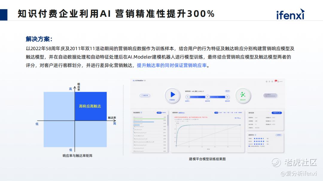 最后讲营销最适化,在有限的预算之下,通过AI智能可以知道哪些产品、渠道更合适,用同样的预算赚到更多钱。举个例子,最近两年所有金融机构都围绕着存量客户,有个国有大行想要交叉销售信用卡,就从存量用户里面交叉销售,但竞争激烈,最大的问题是流失,后来通过AI侦测到易流失的客户,做了一些针对性的运营动作,销售业绩马上得到大幅提升。