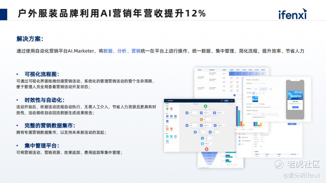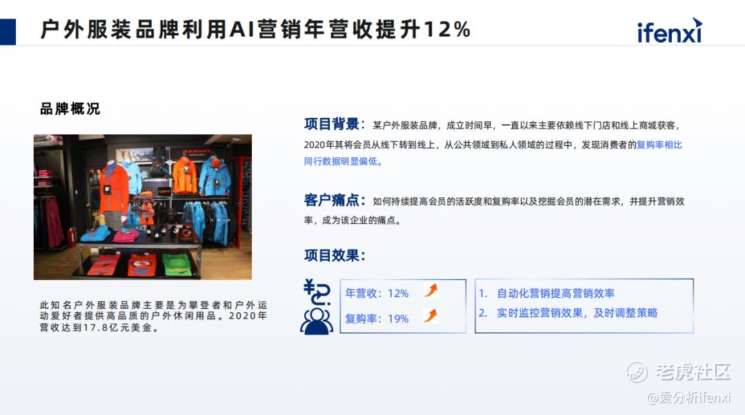 一家大型知名户外品牌,最大问题是人工一年只能做2-4次活动,效率有待提高。要做到营销闭环,而且做一些策略配置,通过有效营销之后,一年可以做 12 次活动,这样整个复购率提升19%,年收益提升12%。自动化营销提高它的营销效率,也透过实时监控及时反馈营销效果。