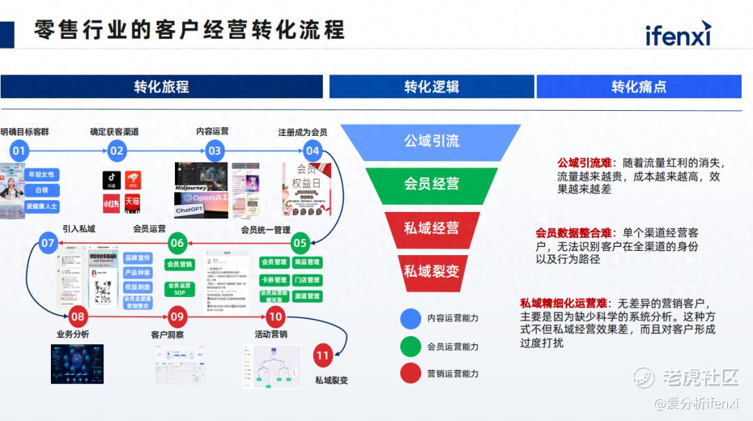 中间转换过程有几个步骤,第一是明确目标客群,根据商品属性找到目标客群,第二确定获客渠道,再进行内容运营。现在大模型中AIGC做生成式的大模型,可以针对性地做内容截取跟运营工作。最终目标是把公域内的游离客户转换成会员。会员管理进入传统CRM系统做经营,有一套会员管理系统或权益,但在企业一般就进行到这一步。如何做有效转换,包括怎么引导客户购买产品、进行价值提升,甚至在客户流失后,怎么挽留、裂变,很多客户没有这方面经验。