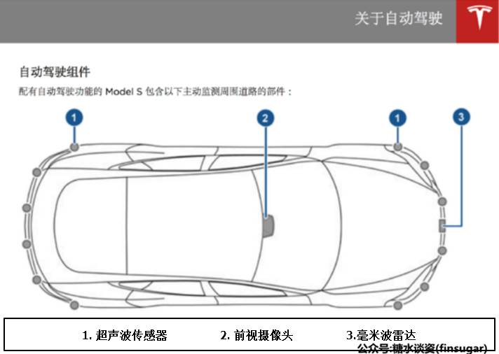 特斯拉的传感器硬件的种类及分布如下图所示: