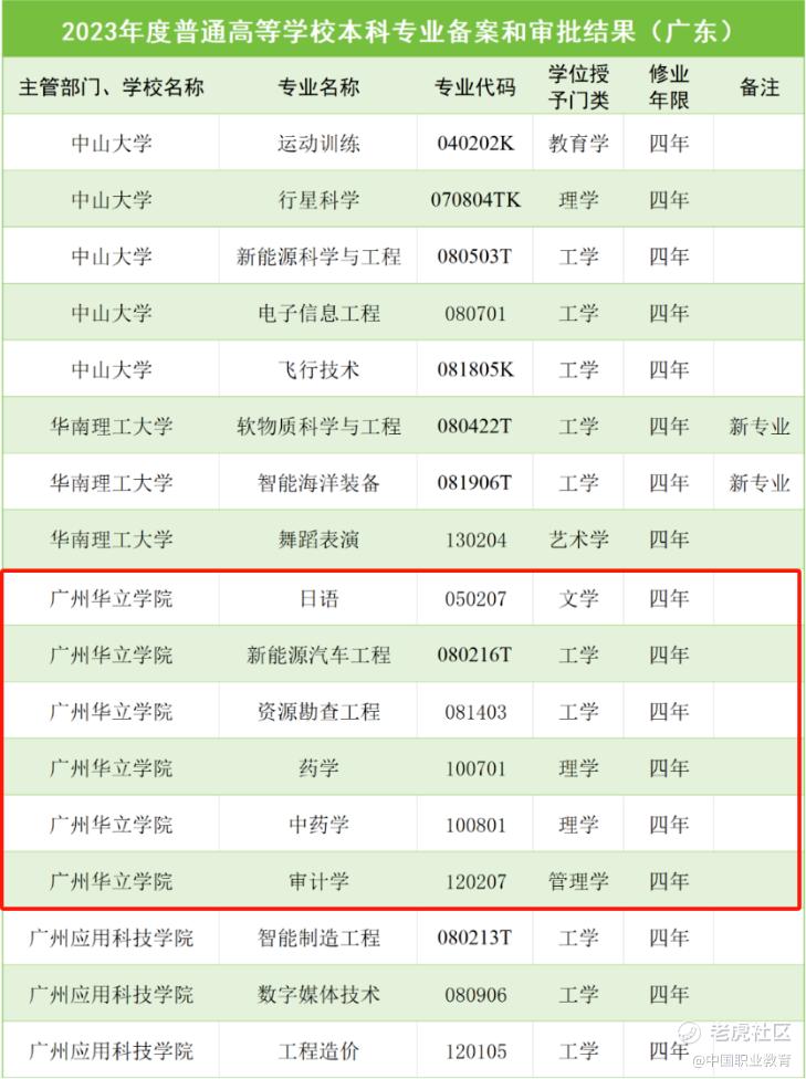 日前,教育部公布了2023年度普通高等学校本科专业备案和审批结果。中国职业教育控股有限公司(「公司」,股票代码:1756.HK)旗下广州华立学院(「华立学院」)2023年度申请增设的新能源汽车工程、资源勘查工程、药学、中药学、日语、审计学六个专业获得教育部批准,新增数量为广东省第一。