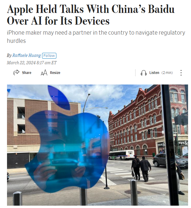 接着,华尔街日报又给出消息,苹果正与百度洽谈,将在国行iPhone 16上,运行百度家的文心一言。