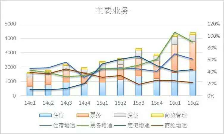 携程的业务板块主要包括四块:住宿、交通票务、旅游度假、商旅管理。16年2季度,这四项业务营收分别为:18亿、20亿、4.7亿、1.5亿。