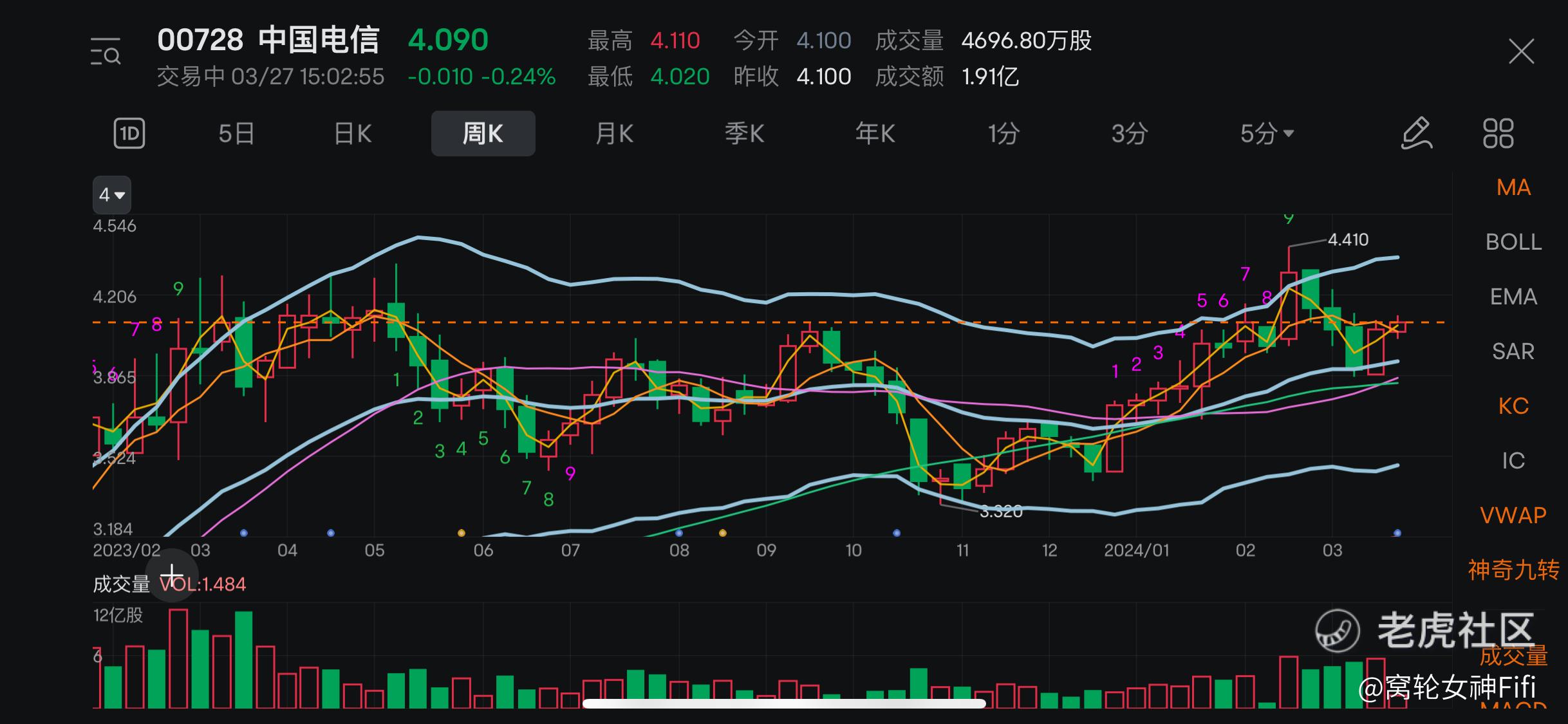 (二)从周K线来看,中国电信在过去一年中反复震荡,波幅较大