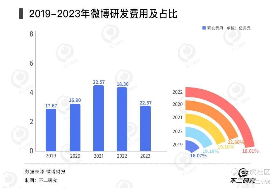 显然成本控制还不是目前阶段微博的重要任务。以研发费用为例,2019—2022年微博的研发费用分别为2.84亿美元、3.24亿美元、4.31亿美元、4.15亿美元,占总收入比重分别为16.07%、19.18%、19.10%、22.60%;2023年,研发费用共3.17亿美元,同比增长35%。