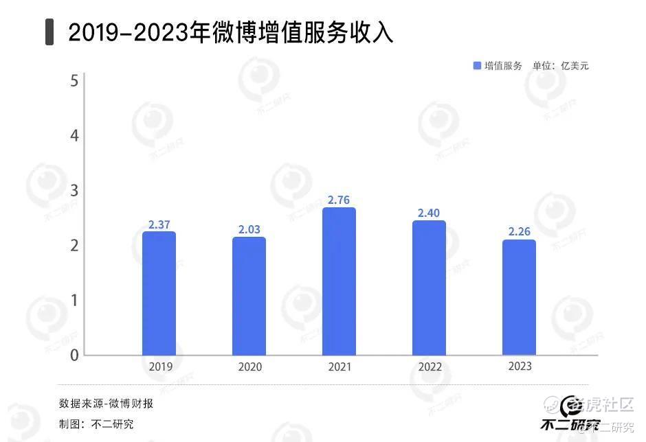 而另一项主营业务——增值服务的表现并不尽人意。财报显示,2019—2023年,微博增值服务收入分别为2.37亿美元、2.03亿美元、2.76亿美元、2.40亿美元、2.26亿美元;根据四季度财报,四季度单季收入为5990万美元,同比增长4%。