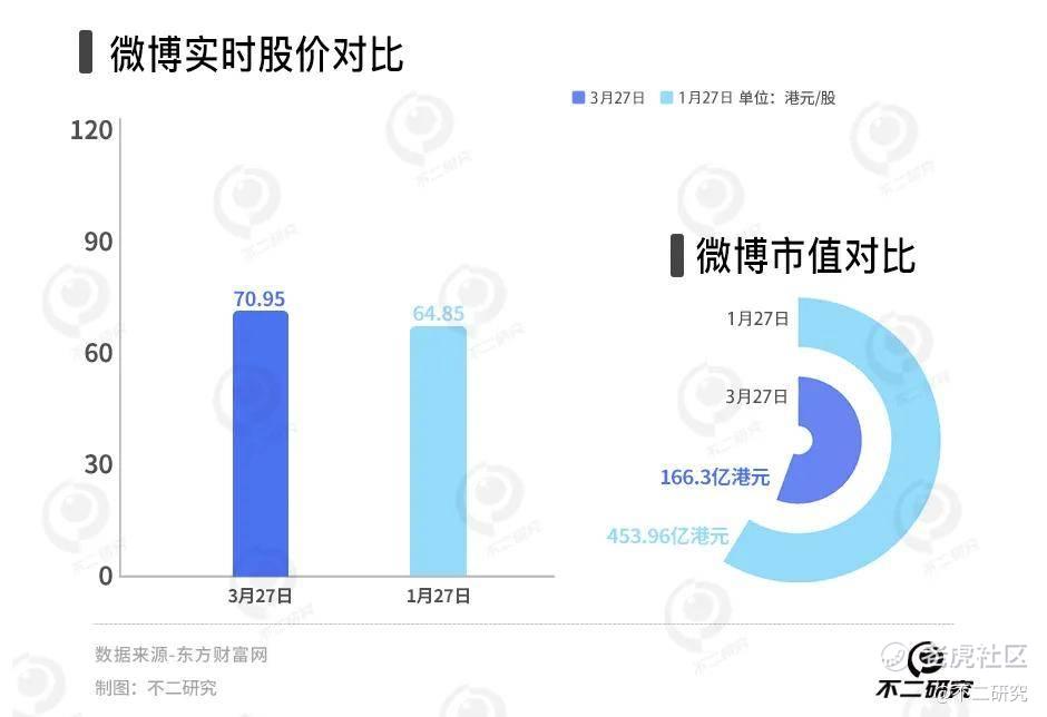 截至3月27日港股收盘,微博报收70.95港元/股,对应市值166.9亿港元(约折合人民币154.21亿元);对比2023年1月的市值高点453.96亿港元,其市值已蒸发287.06亿港元(约折合人民币265.23亿元)。