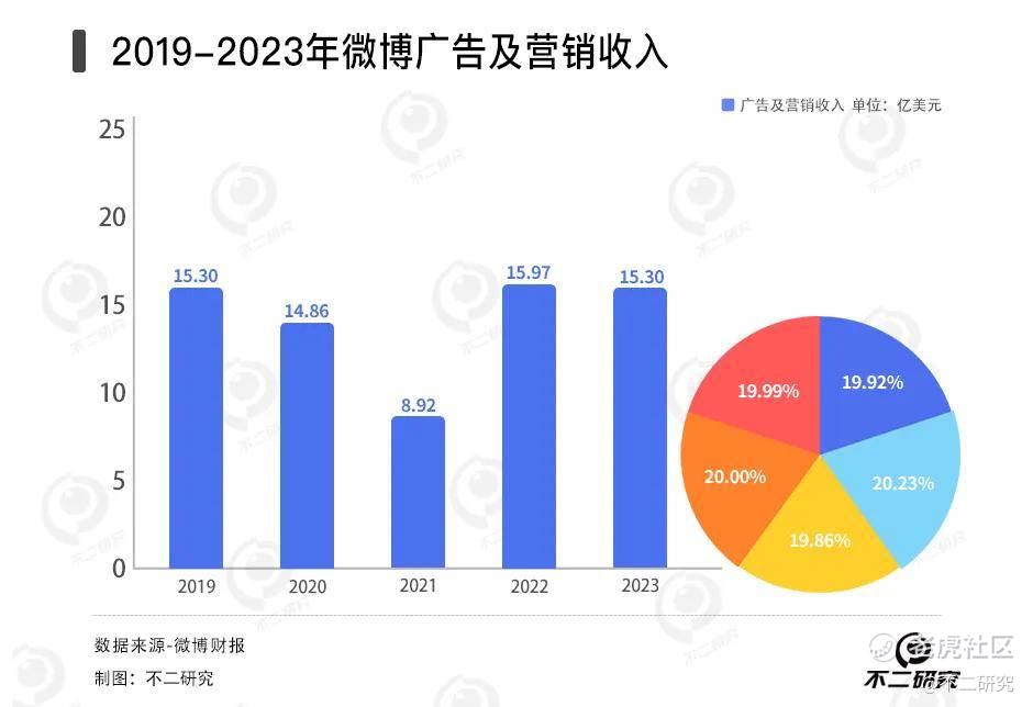 财报数据披露,2019-2023年微博的收入分别为17.67亿美元、16.9亿美元、22.57亿美元、18.36亿美元、17.60亿美元,尽管在2021年有所回升,但整体上并未能恢复到2019年的水平。
