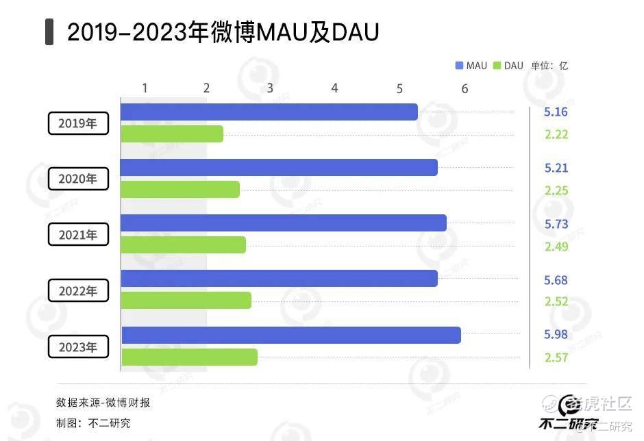 四季报及全年财报显示,截至2023年第四季度末,微博MAU(月活跃用户)数量达5.98亿,同比增长1100万,其中移动端占比为94%;DAU(日活跃用户)数量达2.57亿,同比增长500万。