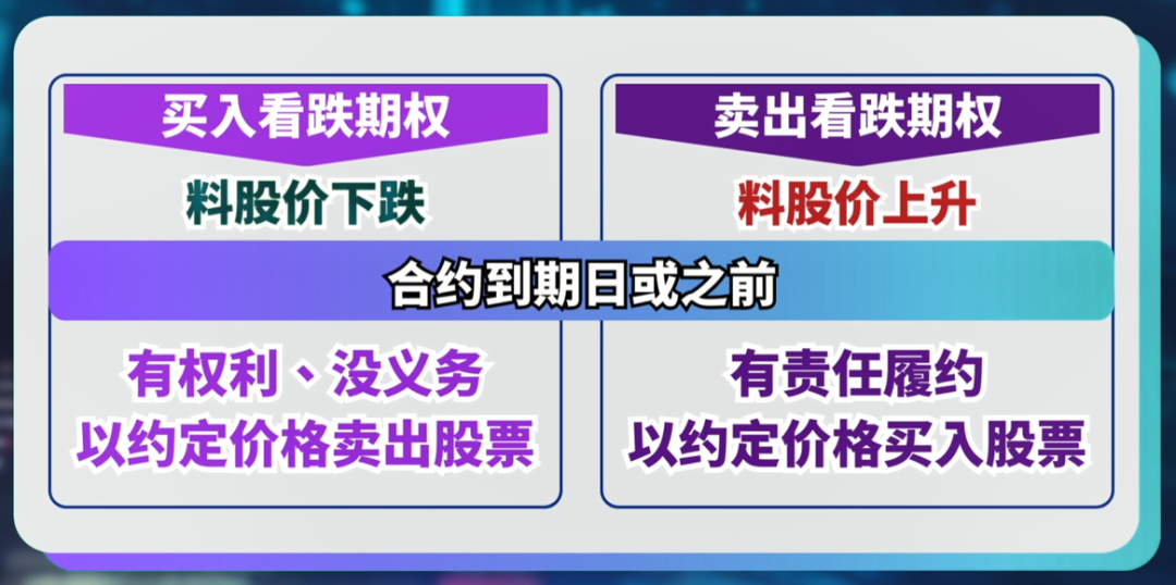 看跌期权的买家有权在合约到期日或之前以行权价出售正股,卖家被行使期权时,则有责任在合约到期日或之前以行权价购买正股。