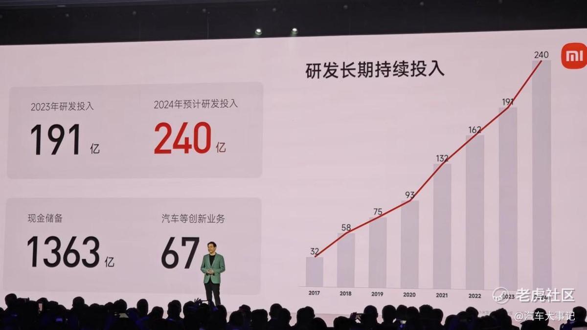 这也是为什么雷军敢于在发布SU7标准版价格21.59万时豪言:21.59万的标准版卖24.59万其实也是亏的。当然,雷军也做好了打算,直接在发布会上晒出了小米今年预计研发240亿元的预告,同时还机灵地补上了小米拥有1363亿的实力现金储备。由此可看出,小米已经做好了前期“亏钱”的打算,而且也有足够的底气“亏钱”。