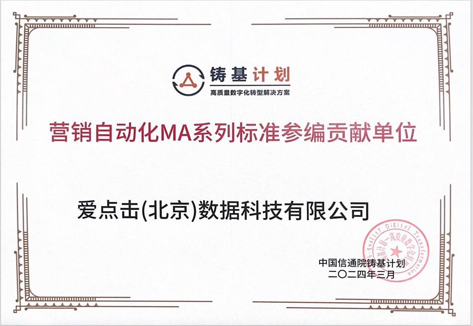爱点击成为营销自动化MA系列标准制定贡献单位,体现了行业对其在营销数字化领域取得成果的认可,也表明公司具备产品能力的复合性和技术方面的先进性。未来,爱点击将以更高标准打造产品,提升服务品质,为客户提供高效的数字化转型服务。